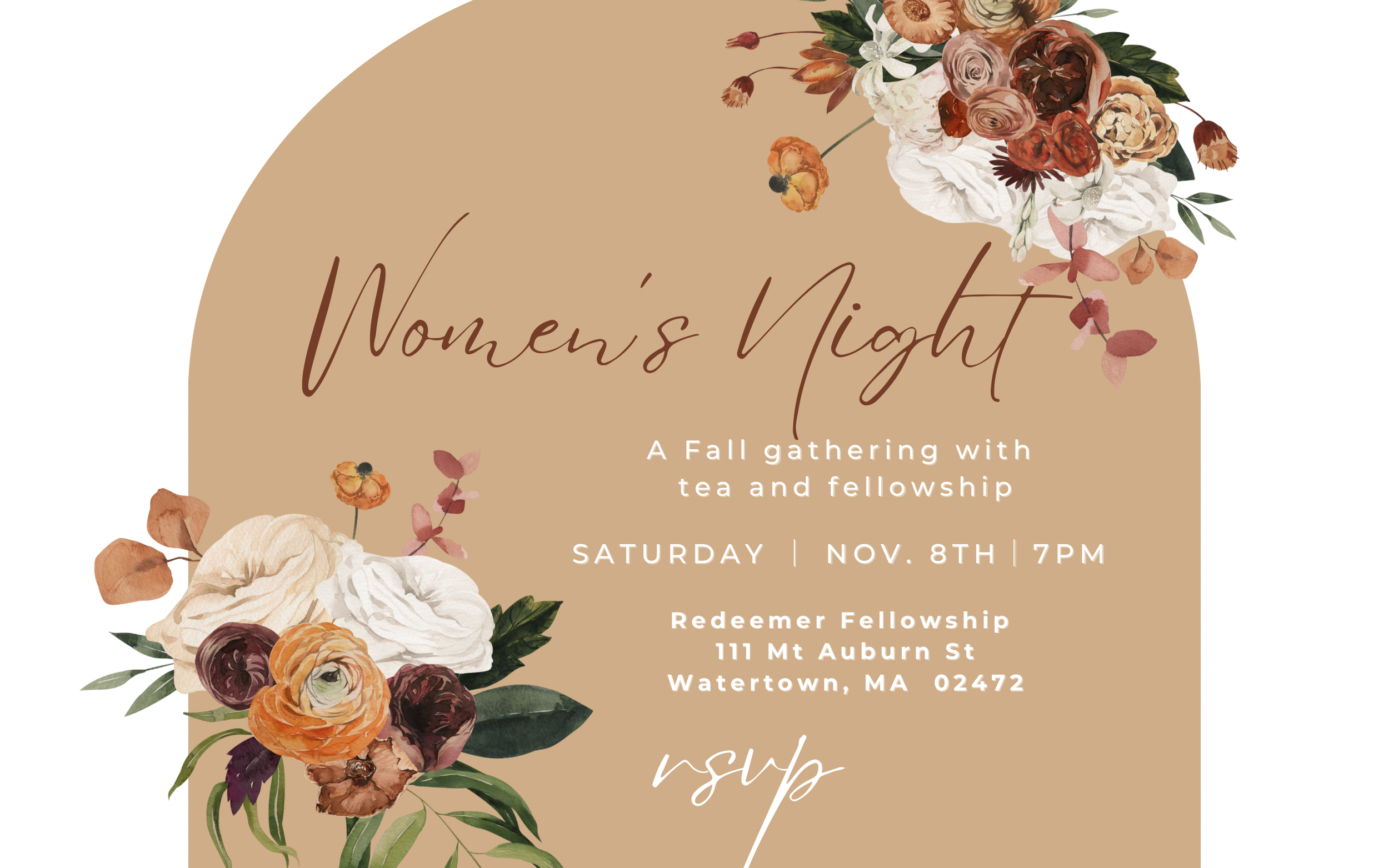 Join the women of Seven Mile Road for a fall gathering at Redeemer Fellowship in Watertown. Bring a friend to join us for a fall craft, tea and treats and a time of reflection and worship. Saturday November 8th @ 7pm. 111 Mt. Auburn St. Watertown